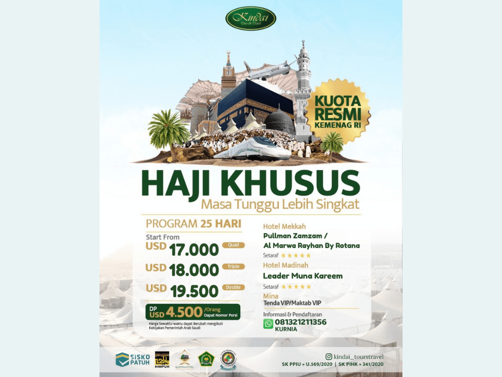 - PERLENGKAPAN : KOPER, KAIN IHROM, MUKENA, SERAGAM KAIN BATIK KINDAI, TAS PASPOR/TAS PINGGANG, TAS SERUT, BUKU DOA, BUKU PANDUAN, ID CARD DLL